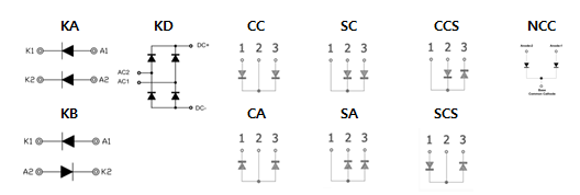KA: Parallel Diode KB: Anti-Parallel Diode KD: Full Bridge Diode CC: Center Common Cathode CA: Center Common Anode SC: Side Common Cathode SA: Side Common Anode CCS: Cathode Common Series SCS: Side Cathode Series NCC: Non-Isolation type Common Cathode |